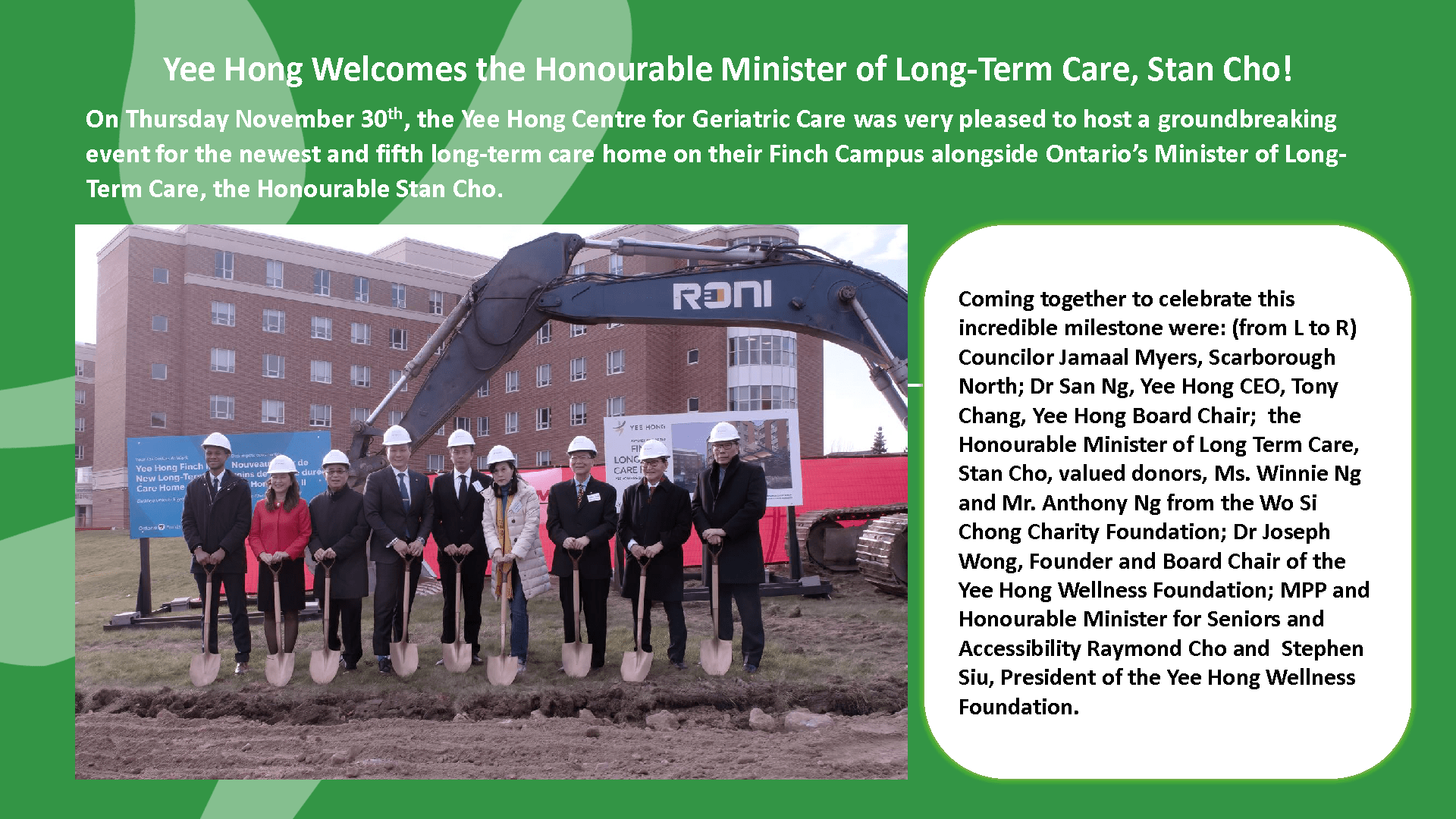 On Thursday, November 30, 2023, Yee Hong Centre for Geriatric Care was very pleased to host a groundbreaking event for the newest and fifth long-term care home on the grounds of their Finch campus, alongside Ontario’s Minister of Long-Term Care, the Honourable Stan Cho.